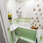 В сан. узлах качественное сан. техническое оборудование. Аккуратная облицовка плиткой.