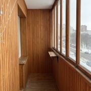 Просторный балкон расположен вдоль всего внешнего периметра квартиры и создает дополнительное тепло. Застеклен, зашит вагонкой.