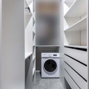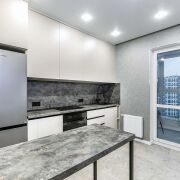 -На кухне установлен современный гарнитур. Матовые фасады в спокойных оттенках, рабочая зона под фактуру бетона, встроенная техника, чёрная графичная фурнитура - кухня выглядит как интерьер из актуального европейского каталога. Пол выполнен из крупного керамогранита, который выдерживает любые нагрузки, не боится влаги и годами сохраняет внешний вид. Стоит фильтр для воды и измельчитель - редкое, но крайне удобное решение, упрощающее быт.