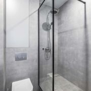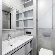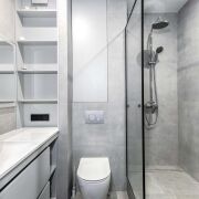 -Санузел совмещенный, оформлен в стиле европейского минимализма. Стены - крупный формат плитки под бетон, встроенные ниши и шкафы создают идеальную систему хранения. Подвесная сантехника, душевая без поддона с чёрным алюминиевым профилем - выбор, свойственный дизайнерским проектам класса «комфорт+». Матовая плитка по полу и стенам делает пространство визуально чистым и очень современным.
