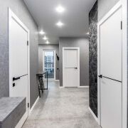 -В коридоре нет визуального шума: только комбинации фактур, мраморная облицовка у двери, большое зеркало на двери и подвесная консоль для мелочей. Керамогранит на полу в едином стиле с кухней, создаёт цельность и одновременно подчёркивает премиальность отделки.