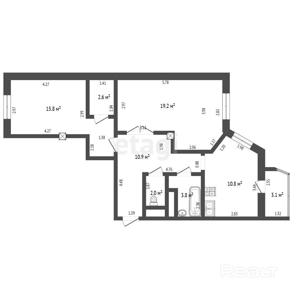 Площадь по СНБ 67.3 кв.м., жилая 37.6 кв. м., кухня 10.8 кв.м.,