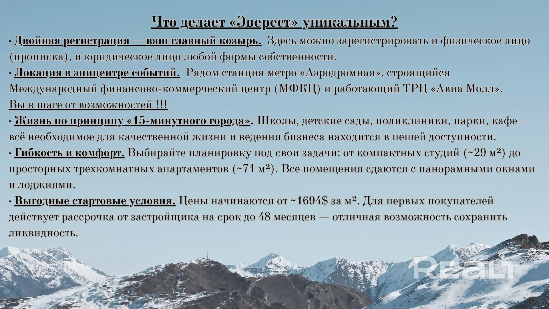 Апартаменты в «Эвересте» запроектированы по принципу «свободной планировки» и имеют варианты различной площади: