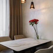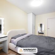 Современная мебель, многофунциональная, с дополнительными местами, для хранения вещей: кровать с подъёмным механизмом в спальне, с выдвижными ящиками в детской, распашной шкаф в гостиной, с зеркальными дверьми- стильное и практичное решение , увеличивающее пространство самой гостиной.