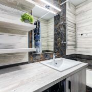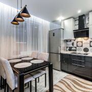- Кухня оборудована всей необходимой бытовой техникой. Несколько режимов освещения позволяют менять атмосферу для семейных или романтических ужинов, а бар-сервант с подсветкой добавляет выразительности и функциональности.