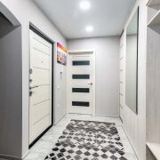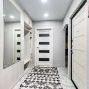 - В коридоре обустроена вместительная гардеробная. Места достаточно для сезонных вещей, обуви и чемоданов, всё аккуратно размещается по своим местам.