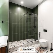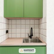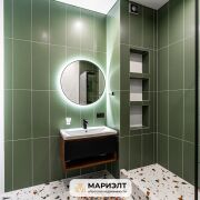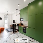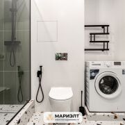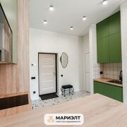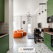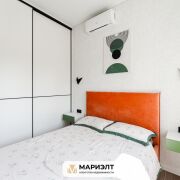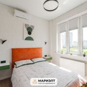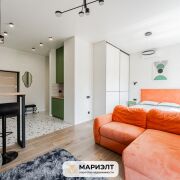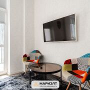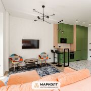 Современный дизайнерский ремонт с интересным сочетанием цветов в интерьере. Использованы только качественных строительные материалы. Стены выровнены и оклеены итальянскими обоями. На полу уложена плитка. В санузле установлена качественная сантехника.