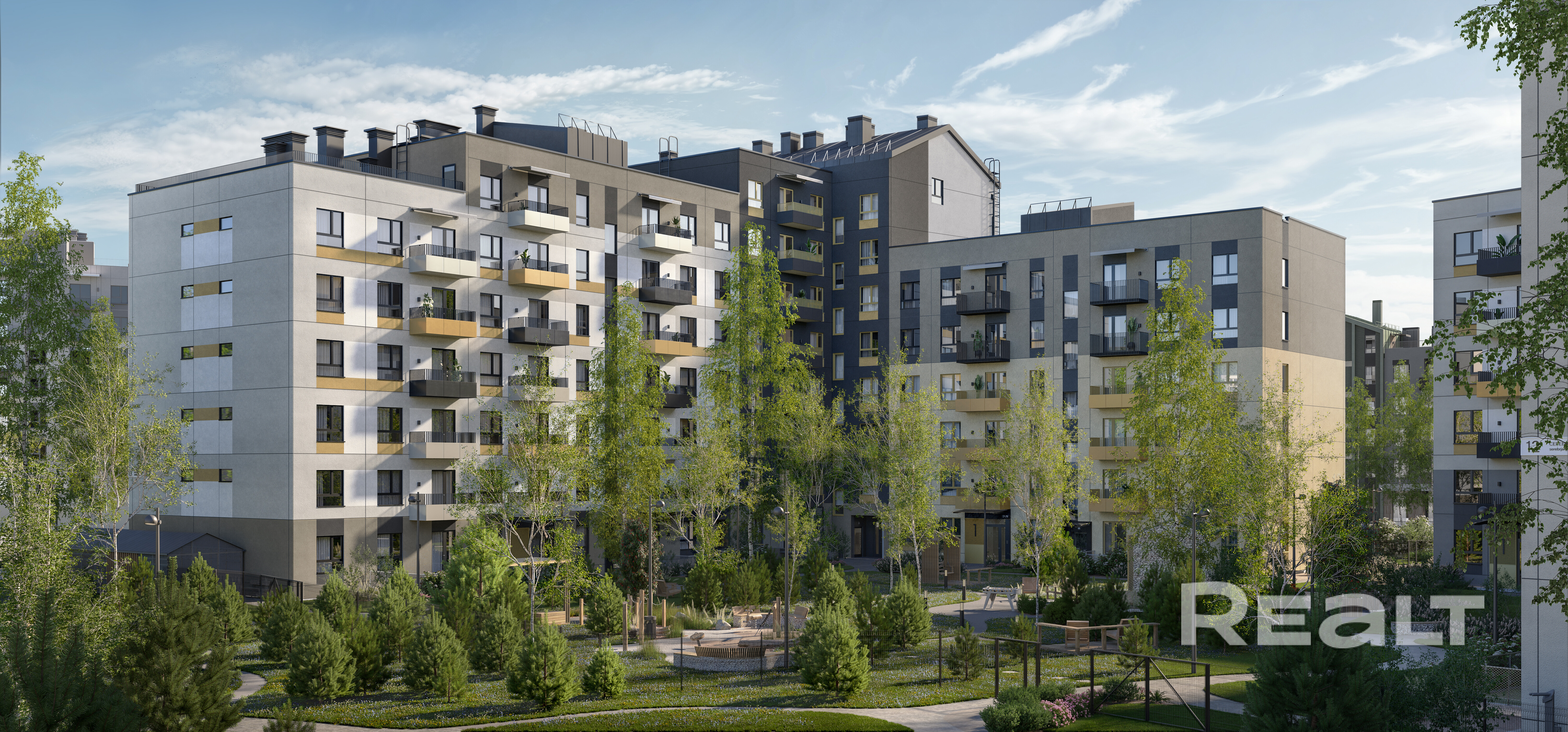 Территория двора сохраняет концепцию закрытой территории без автомобилей и парковок. Ограждение еврозабором высотой 1,6 м. Видеонаблюдение дворовой территории и по периметру группы домов