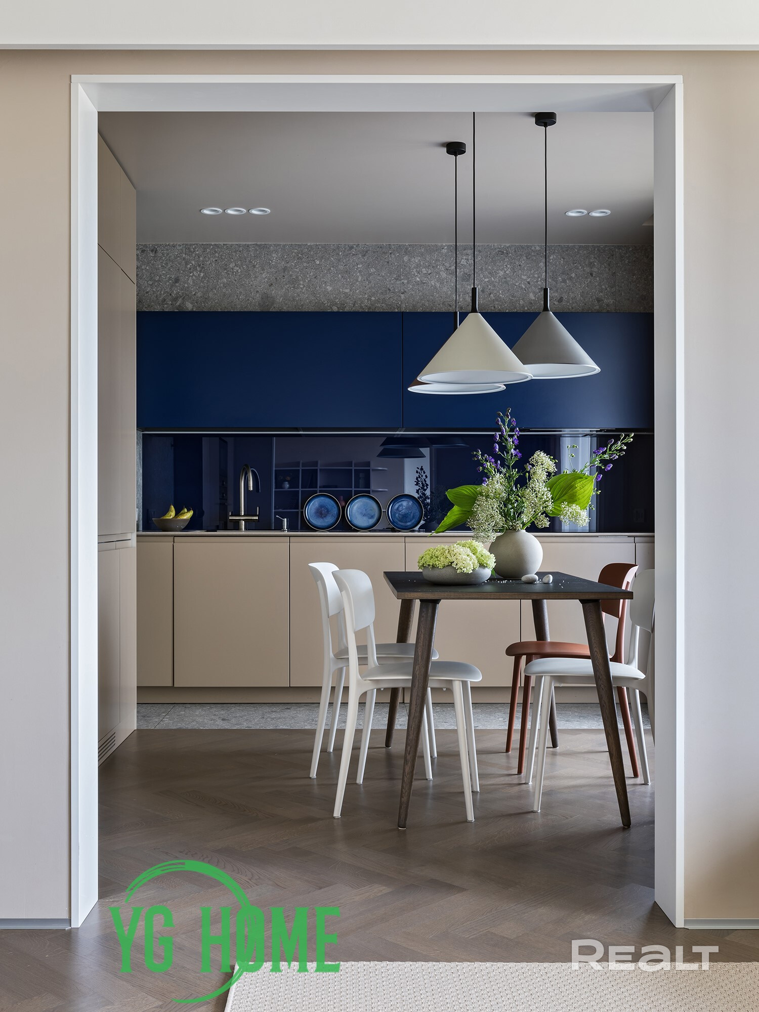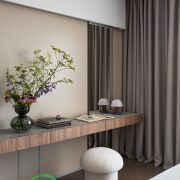 ● Спальня: Уютное пространство с гардеробной, консолью с полками, декоративной подсветкой, зеркалом, тумбочкой и прикроватными столиками. Шторы-блэкаут с электроподъемником обеспечивают идеальные условия для отдыха.