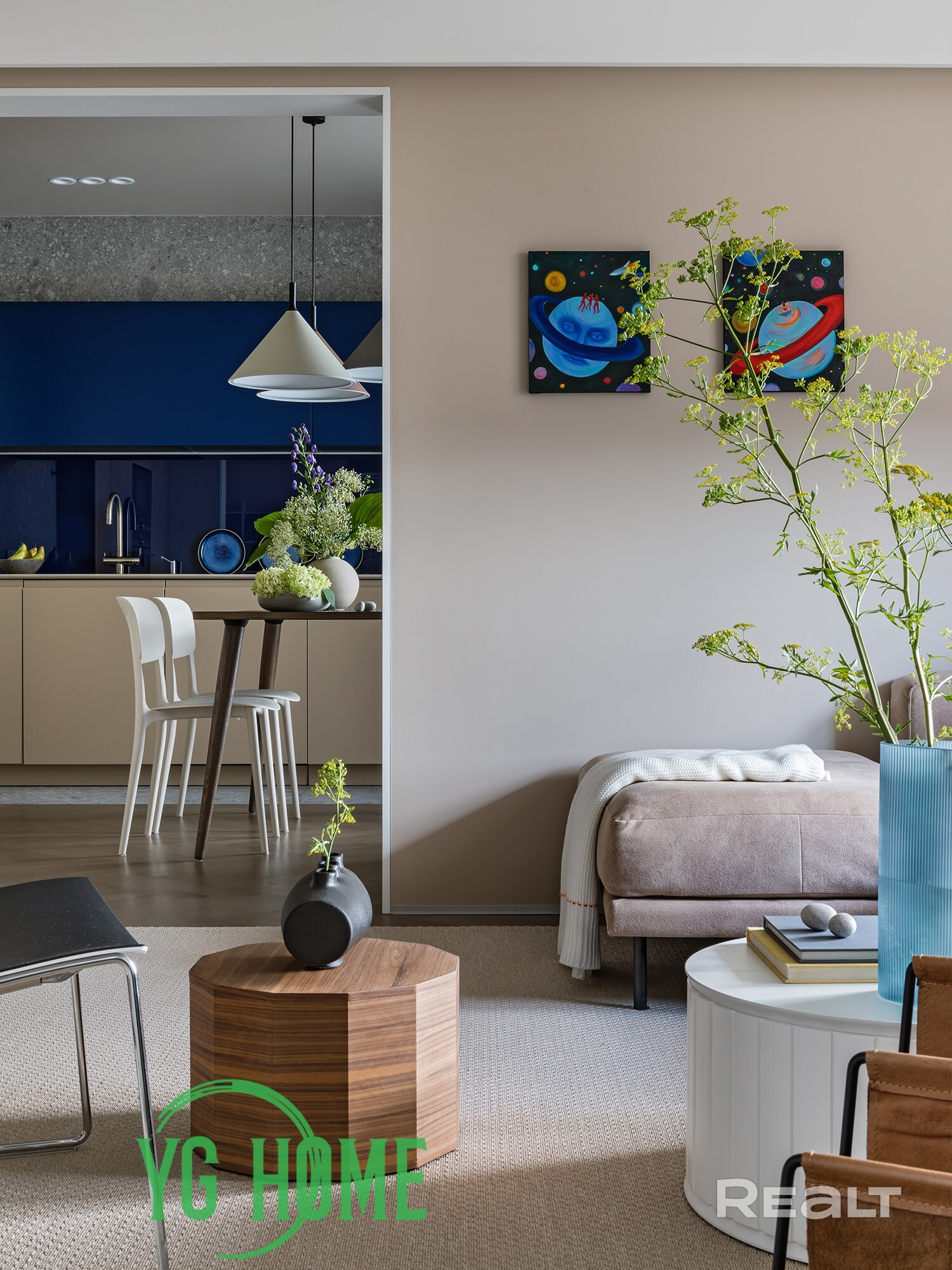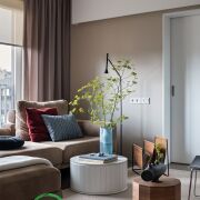 ● Гостиная: Просторная и светлая, с видом на двор. Оснащена 65-дюймовым телевизором LG OLED, большим модульным диваном с memory foam, стильной консолью с выдвижными декоративными элементами и двумя столиками. Шторы с электроподъемником добавляют комфорта и современности.