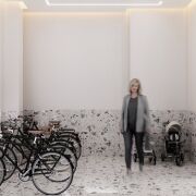 В доме роскошное дизайнерское лобби, которое напоминает вестибюли дорогих отелей. Высота потолков здесь достигает 3,9 м. Площадь лобби составляет 61,8 «квадрата». Есть ресепшн. Это рабочее место консьержа — специалиста, следящего за порядком. Для комфорта родителей обустроена туалетная комната с пеленальным столиком для малышей.