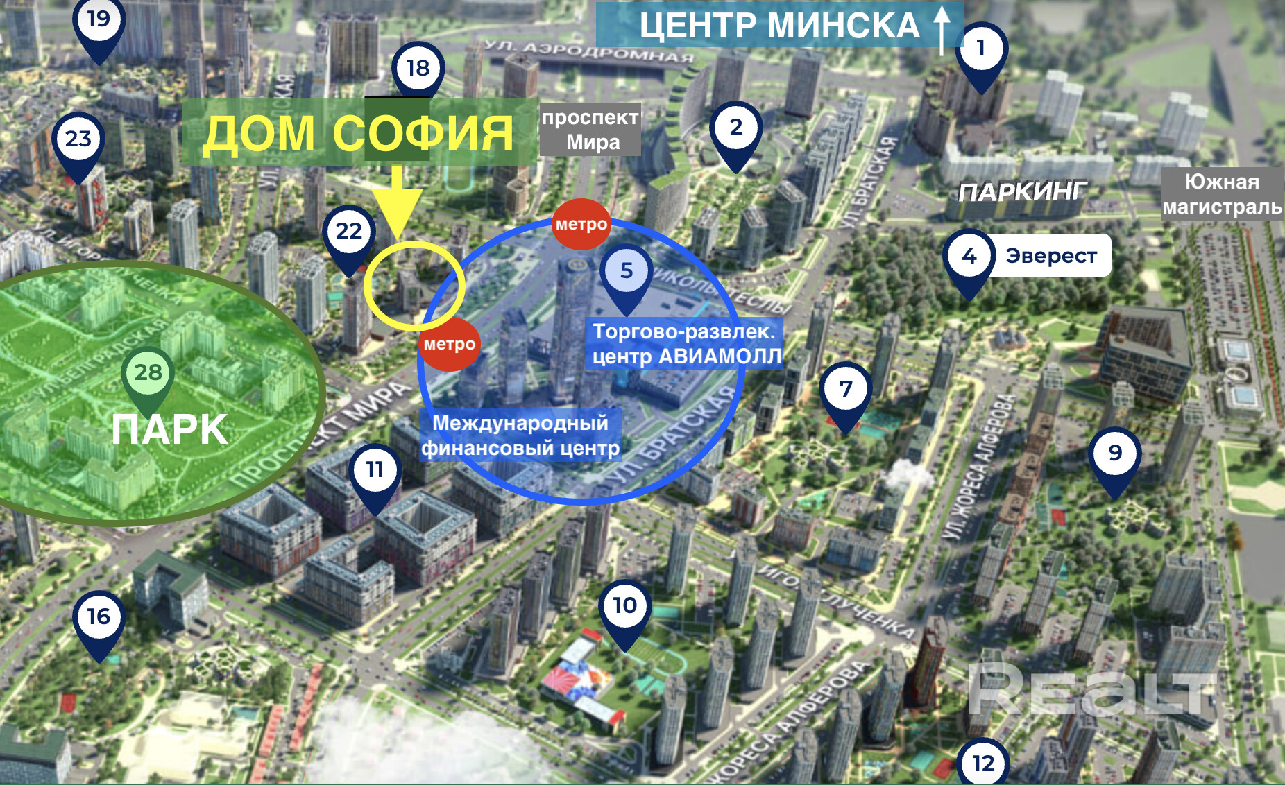 Дом уникален: локация у входа в метро, Международного финансового коммерческого центра, торгово-общественного центра «Авиа Молл». В самом центре Минск-Мир, в центре событий!
