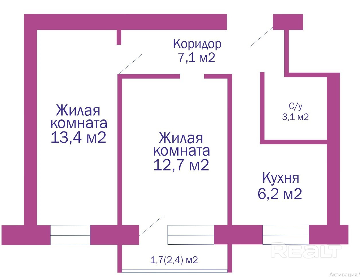 Общая площадь: 44.2 м2, жилая 26 м2, кухня 6.2 м2.