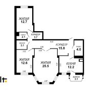 Три раздельные комнаты (25.5, 12.6 и 12.2 кв.м), кухня – 12.2 кв.м, с выходом на остекленный балкон.