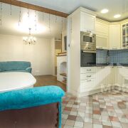 - На полу кухонной зоны уложена плитка. Стильный кухонный гарнитур,  встроенная техника - идеальное место для приготовления любимых блюд.