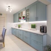 Встроенная кухня из массива с надёжной фурнитурой от ведущего производителя. Техника фирмы Bosch - варочная поверхность, духовой шкаф, вытяжка, посудомоечная машина, холодильник, СВЧ печь. Обеденная группа установлена у окна, из которого открывается вид во двор и на лес.