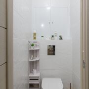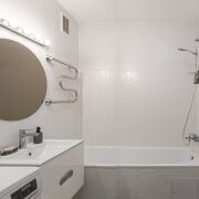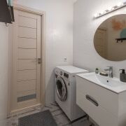Раздельный санузел облицован плиткой, установлена ванна, подвесная тумба с раковиной, зеркало, стиральная машина. Инсталляция с подвесным унитазом.