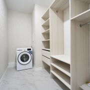 Есть вместительная гардеробная комната с местами и полками для хранения и установленной и подключенной стиральной машиной.