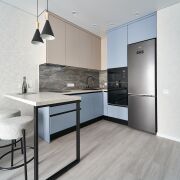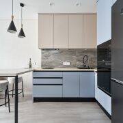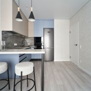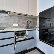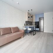 Встроенная кухня совмещена с гостиной и полностью оборудована всей современной техникой, необходимой для жизни: варочная поверхность, вытяжка, посудомоечная машина, духовой шкаф, микроволновая печь, холодильник. Установлен фильтр воды.