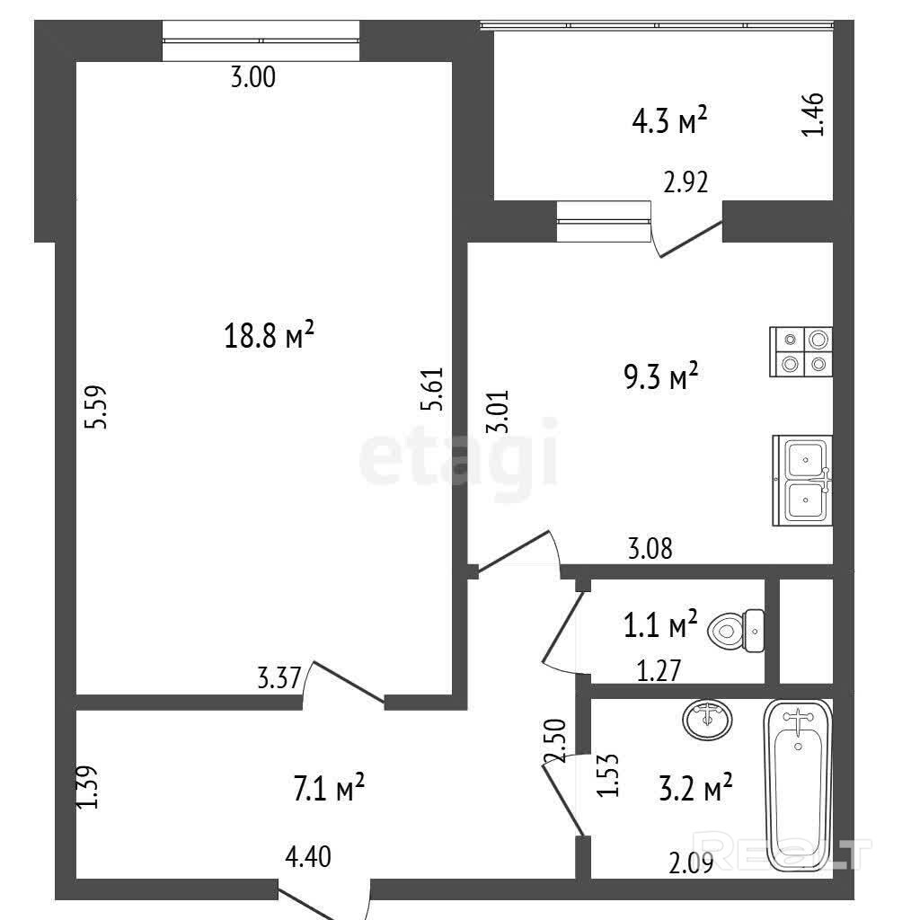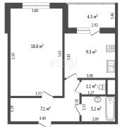Квартира расположена на 1-м этаже панельного 9-этажного дома 2016 года постройки. Общая площадь квартиры 42,5м2 по СНБ. Большая жилая комнаты площадью 18,8м2.