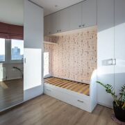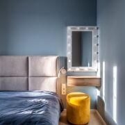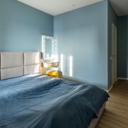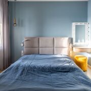В спальне установлена полноценная двуспальная кровать (с местами для хранения), туалетный столик и возможно размещение телевизора на стене.