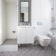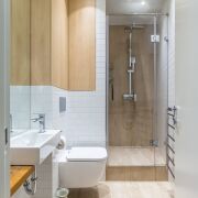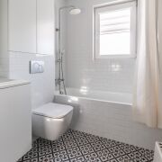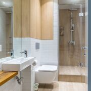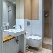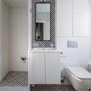 Гостевой санузел: совмещенный, в современной плитке, установлена душевая кабина, умывальник, инсталляция и бойлер на большой объем с функцией Wi-fi.