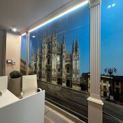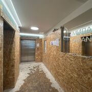 Дизайнерское оформление лобби: место для консьержа, зона ожидания и санитарная комната.