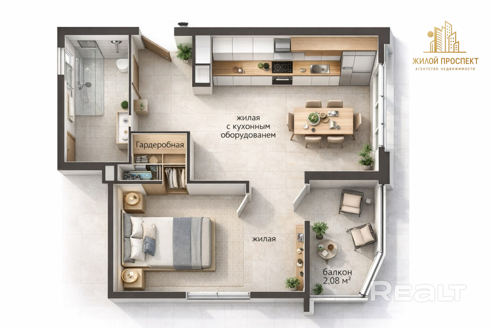Несмотря на компактный метраж, квартира ощущается просторной за счёт грамотной организации пространства и света.