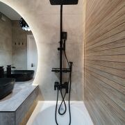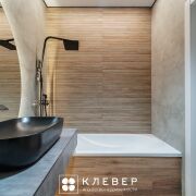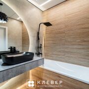 Установлен датчик протечки воды, теплый пол и стена в зоне сушки полотенец.