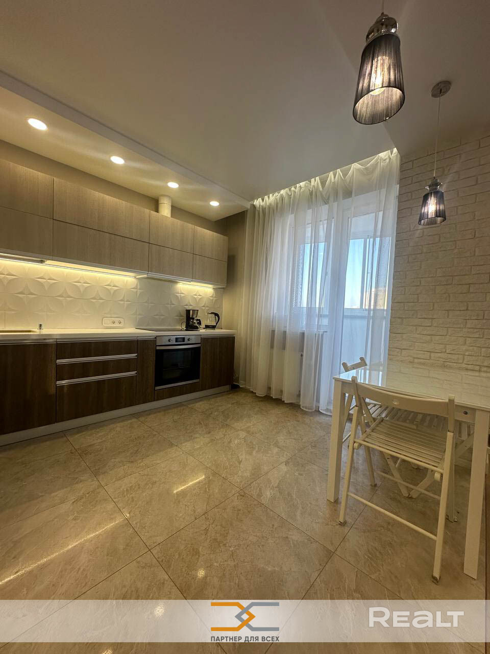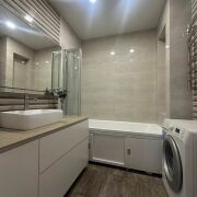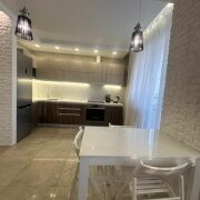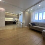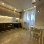 Кухонная зона 11.6 м.кв. оснащена итальянскими фасадами Cleaf Rovere Provenza, фурнитура производства Австрии (Blum tandembox+ и metabox), столешница акриловый камень. Техника: холодильник Indesit, сварочная панель Bosch, духовой шкаф Indesit, посудомоечная машина Indesit. Теплые полы в коридоре и кухне. В кухонной зоне столовая группа переходит в гостиную зону площадью 19.3 м.кв. По периметру кухни-гостиной большой застекленный балкон площадью 8.8 м.кв.