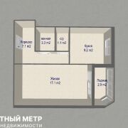 Общая площадь 37,8 кв. м., жилая площадь 17,1 кв. м, кухня 9,2 кв. м. высота потолков 2.55 м., просторная лоджия.
