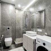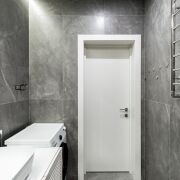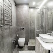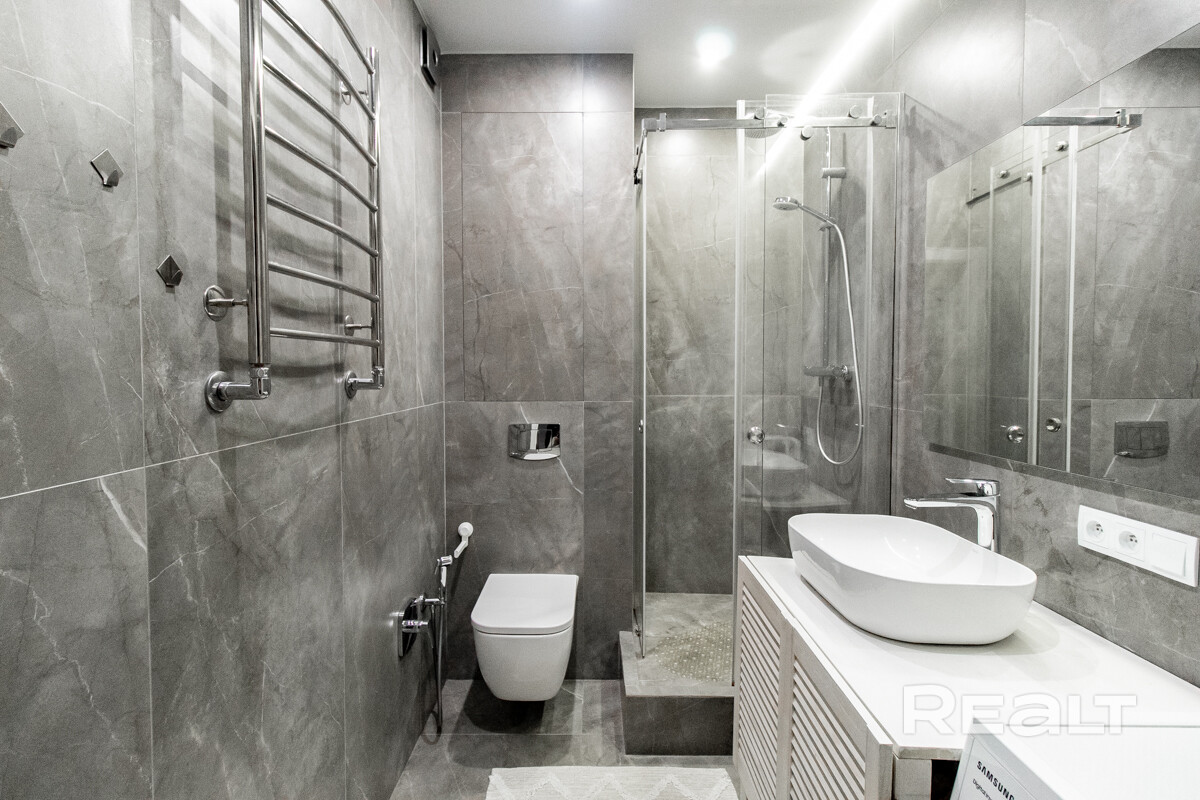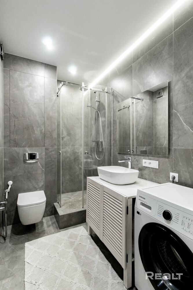 В ванной керамогранит Италия, смесители Hansgrohe.