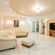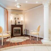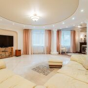- Гостиная впечатляет простором и изысканным интерьером. Круглая потолочная композиция с подсветкой, колонны и декоративный камин подчёркивают архитектурную эстетику пространства. Большие окна наполняют комнату мягким светом, а удобная зона отдыха гармонично завершает интерьер.