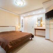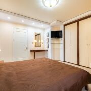 - Спальня включает кровать, прикроватные тумбы и большой шкаф. Кондиционер устанавливает комфортную температуру. Ковролин даёт мягкое покрытие по всей площади.