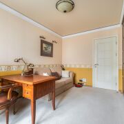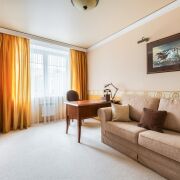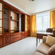 - Кабинет с встроенной мебелью во всю стену и рабочим столом. Большое окно обеспечивает естественное освещение для продуктивной работы.