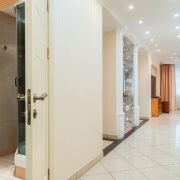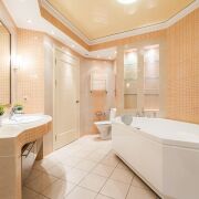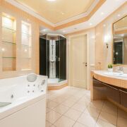 - Санузел совмещенного формата оснащён джакузи и душевой кабиной. Плиточная отделка и подсветка создают аккуратный визуальный облик. Установленное оборудование позволяет сразу пользоваться всем функционалом.
