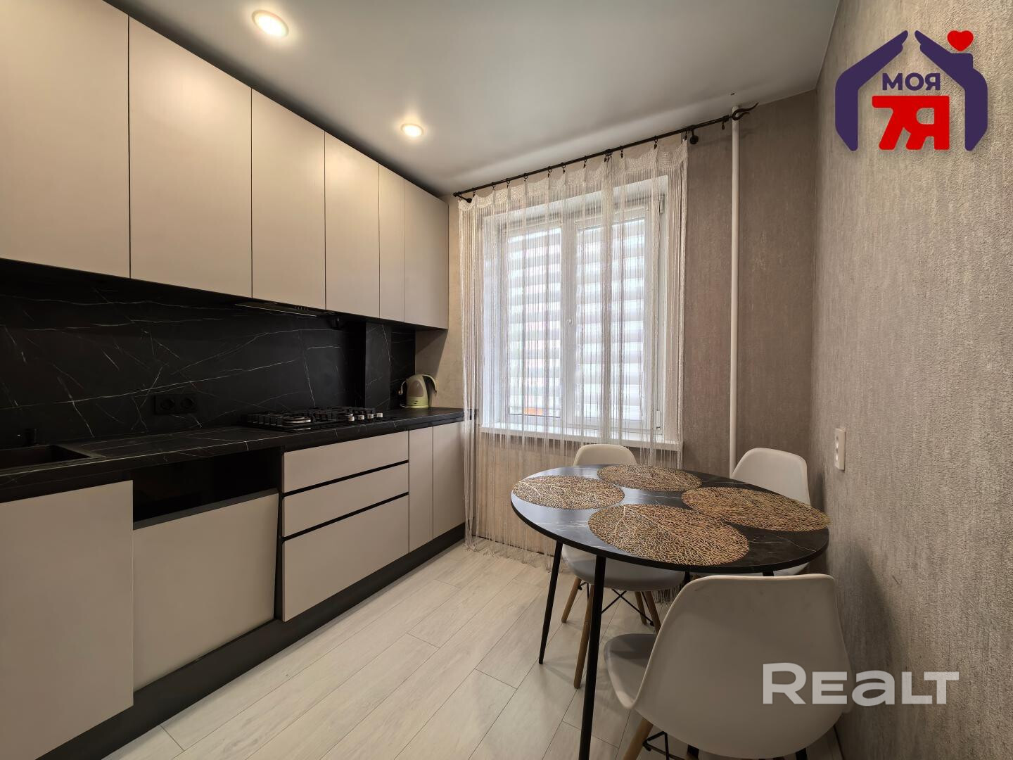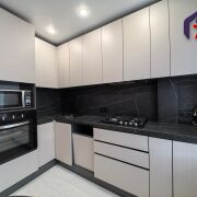 -На кухне, площадью 7,1 кв.м. установлен стильный кухонный гарнитур со встроенной варочной панелью, местом под посудомоечную машину и удобной широкой столешницей под камень.