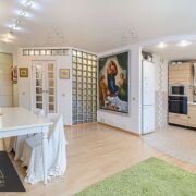 Продуманное пространство: кухня объединена с гостиной в единую зону площадью 25,7 кв. м (перепланировка официально утверждена). Идеальное место для семейных вечеров и встреч с друзьями.