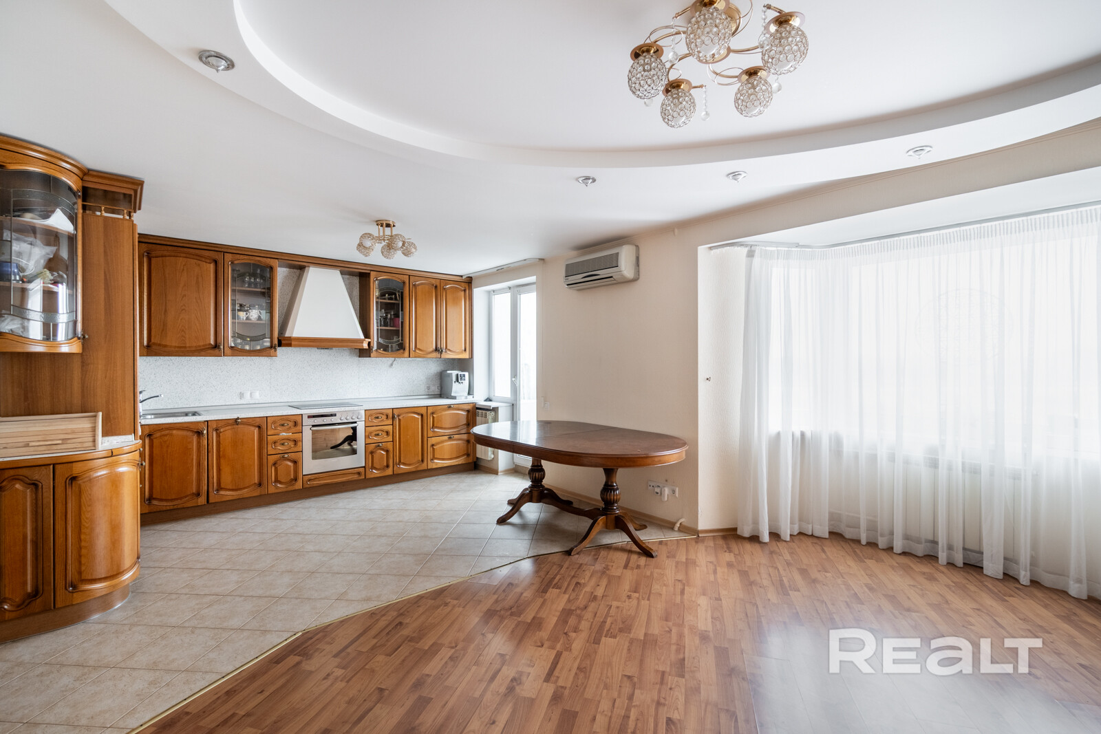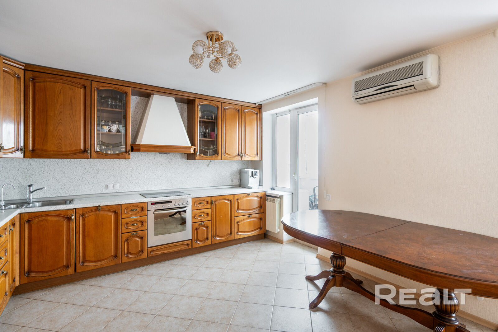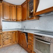 Кухня выполнена из натурального дерева, установлена встроенная техника. Фасады можно перекрасить под свой интерьер без замены мебели.