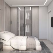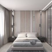 Просторная спальня – оазис тишины и спокойствия. Санузел отделан высококачественными материалами и оснащен современной сантехникой. Вместительная гардеробная комната поможет организовать хранение вещей. Цветовая гамма квартиры подобрана безупречно, а многоуровневое освещение создает неповторимую атмосферу.