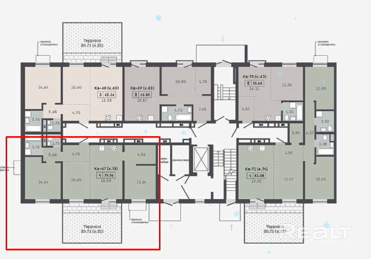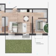 Квартиры на 1 этаже с личными участками-террасами с видом во двор и зеленый коридор.
