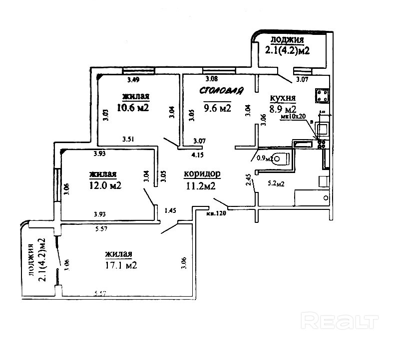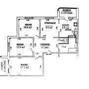 Общая площадь по СНБ: 80, жилая 39,7, кухня-столовая 18,5.