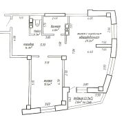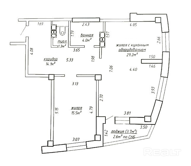 Квартира состоит из жилой комнаты (15.5 кв.м.), жилой комнаты с кухонным оборудованием (29.2 кв.м.), коридора (14.1 кв.м.), санузла (1.3 кв.м.), ванной (4.0 кв.м.) и лоджии (2.6 кв.м.). Высота помещения 2,56 м. Площадь по СНБ 66.7 кв.м. Окна квартиры смотрят в сторону проспекта Победителей.