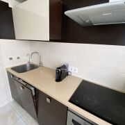 Кухня оборудована встроенной техникой: посудомоечная машина, плита, духовой шкаф, столешница и подоконник (продолжение столешницы) из кварцевого агломерата.