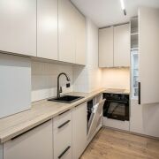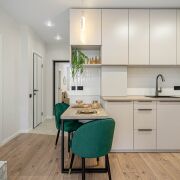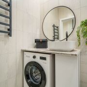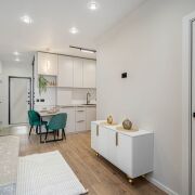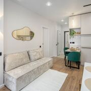 -Пол в жилой комнате и кухне выполнен из качественного ламината, уложенного на премиальную пробковую подложку (5мм), что делает его теплее и уютнее. А также избавляет ваших соседей снизу от возможного лишнего шума.