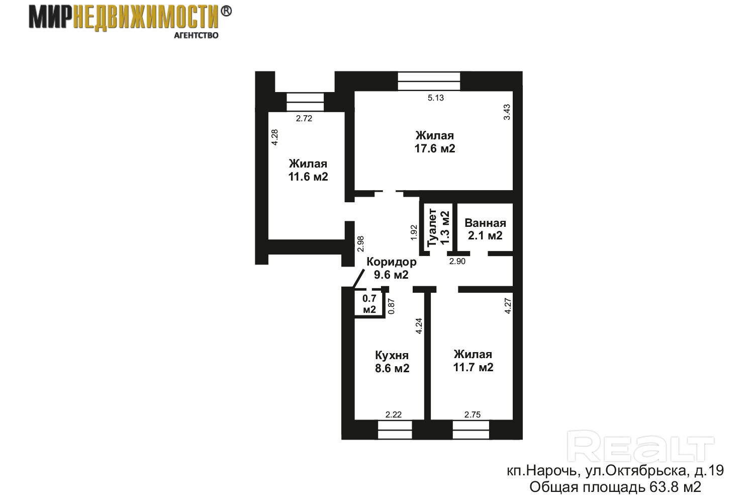 Общая площадь 63,8 м2, жилая площадь 40,9 м2, кухня 8,6 м2. 1/5 этажного кирпичного 1998 года постройки. Квартира состоит из трех раздельный комнат, просторной кухни (8,6 м2), раздельного санитарного узла. Окна выходят на две стороны света. Есть подвал.