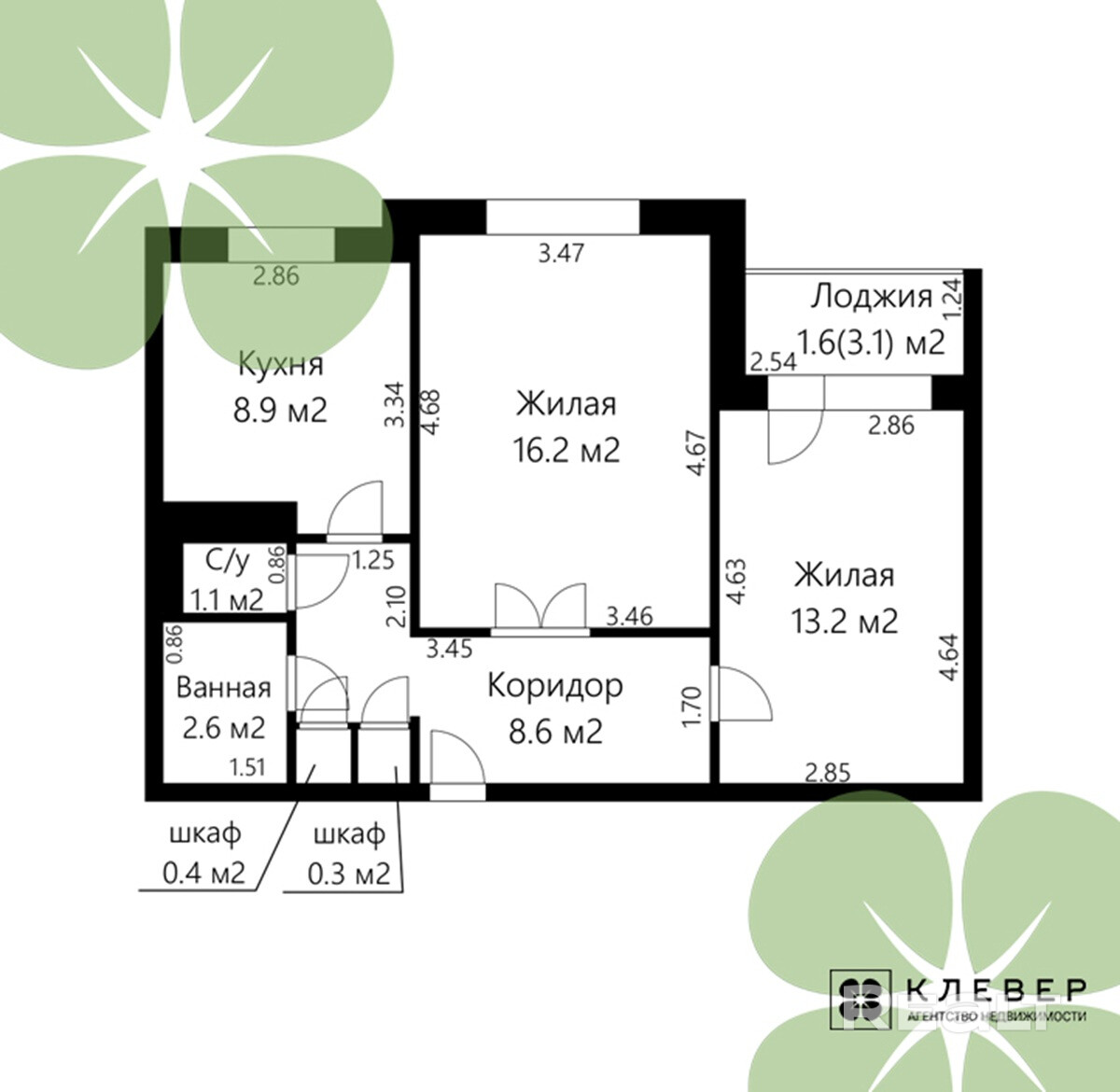 · общая площадь жилых комнат 29,4м2 (16,2 м2 и 13,2 м2)