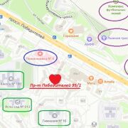 В 100 м от дома — ясли‑сад № 512, СШ № 180, гимназия № 16, Городская поликлиника № 4, банки, аптеки, магазины, салоны и др.