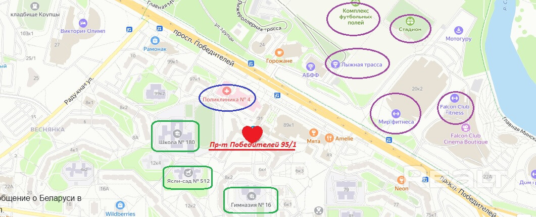 До центра Минска — 10 минут по пр‑ту Победителей; удобный выезд на Минскую кольцевую дорогу.