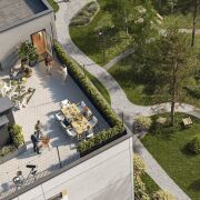Особенность первого этажа — собственная территория с индивидуальными террасами площадью от 19,5 до 23,2 квадратных метров, открывающими прекрасный вид на зелень вокруг. Последний этаж отличается наличием эксклюзивной квартиры с отдельным выходом на большую 126-метровую террасу и панорамным видом на окрестности. А угловые квартиры оснащены двупольными пространствами с двумя уровнями и оригинальными наклонными потолками.